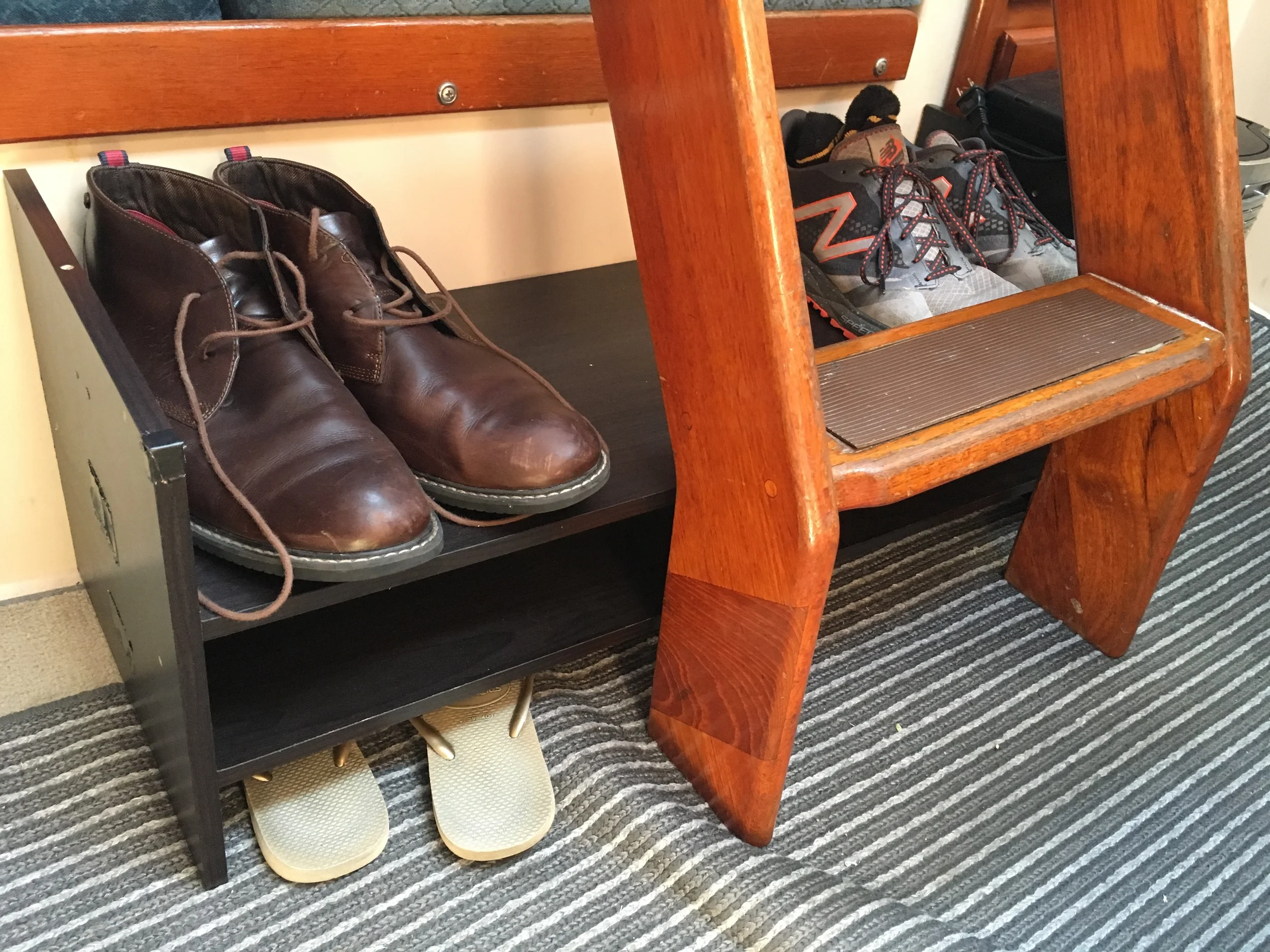 Finally put in a shoe rack- custom shelf sizes possibly by accident. It had to fit under the stair-ladder