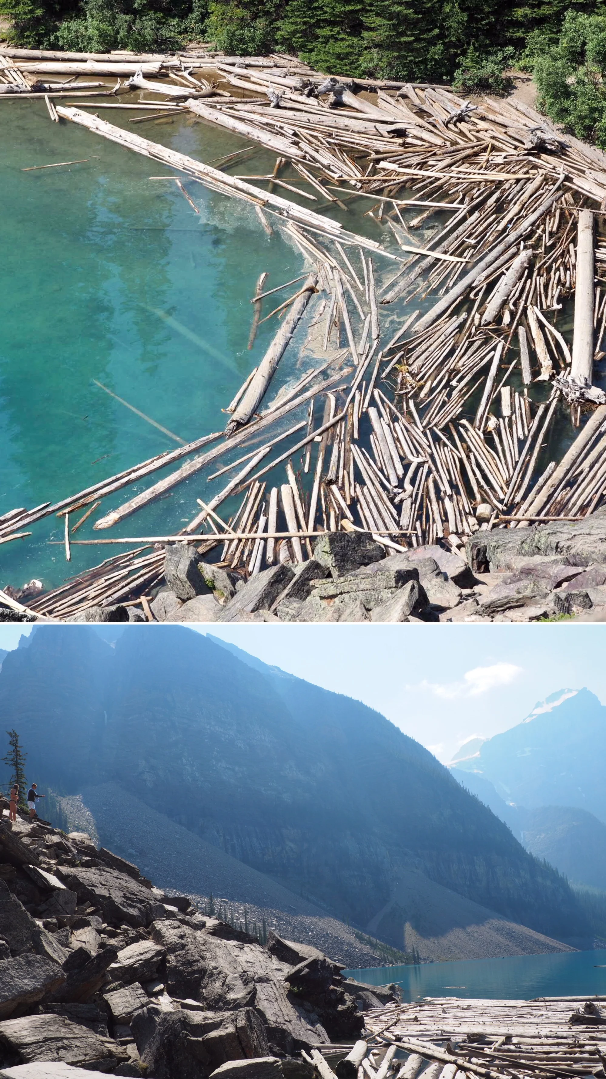 a natural damn of logs bottlenecks the glacial runoff from leaving Lake Moraine, also allowing a crossing to a large rock pile to climb.