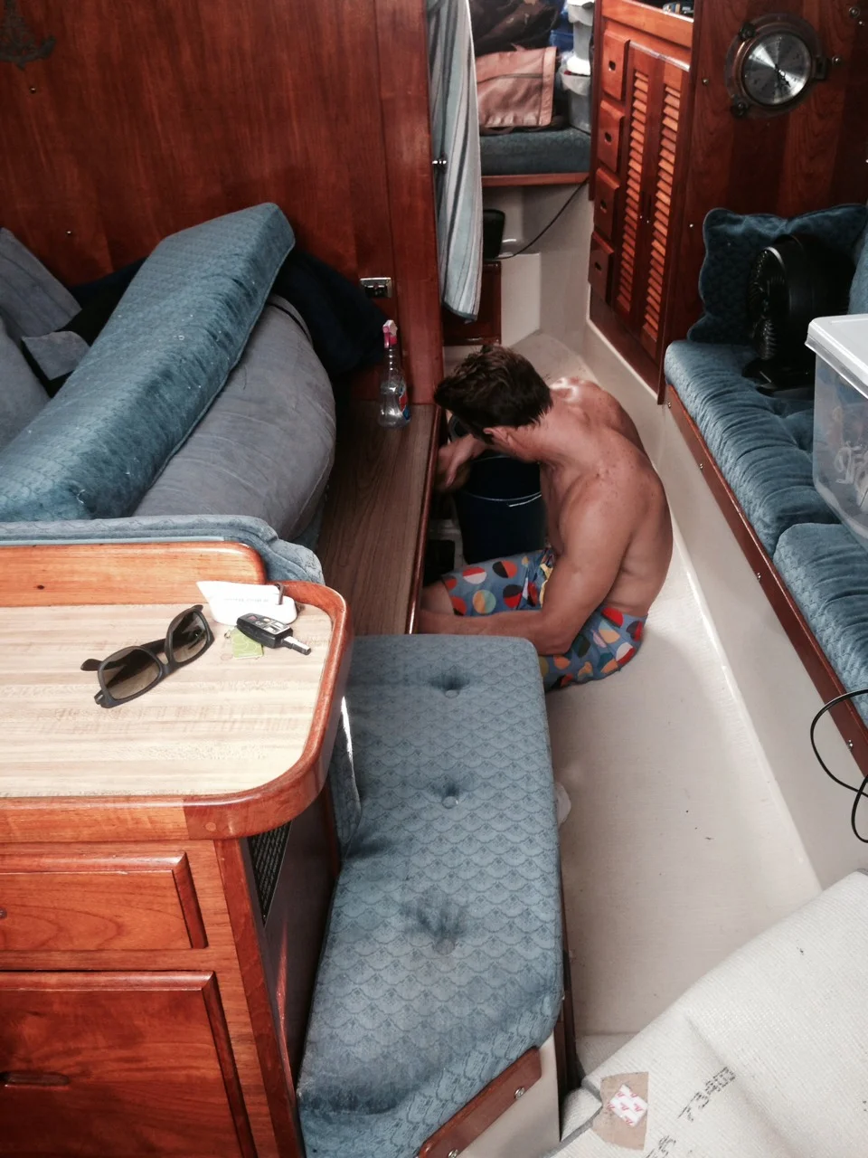 We decided to anchor because the wind and weather was favorable and we were already out there. I re organized the closet to be just hanging jackets, and I stacked my pants in the v berth. I prefer this over the overly-stuffed locker and pants I had to iron every time I wore anyways. I also soaked up and cleaned the bilge to check it out and see about recovering the screw the mechanics dropped. I didn’t find that, but I did find out the auto bilge pump isn’t working. Now, it could be the float switch, it could be the bilge pump, it could be the electrical. So there you have it, my good intentions reveal more problems. But it’s better to know about them than have something serious fail, break, or sink my boat.