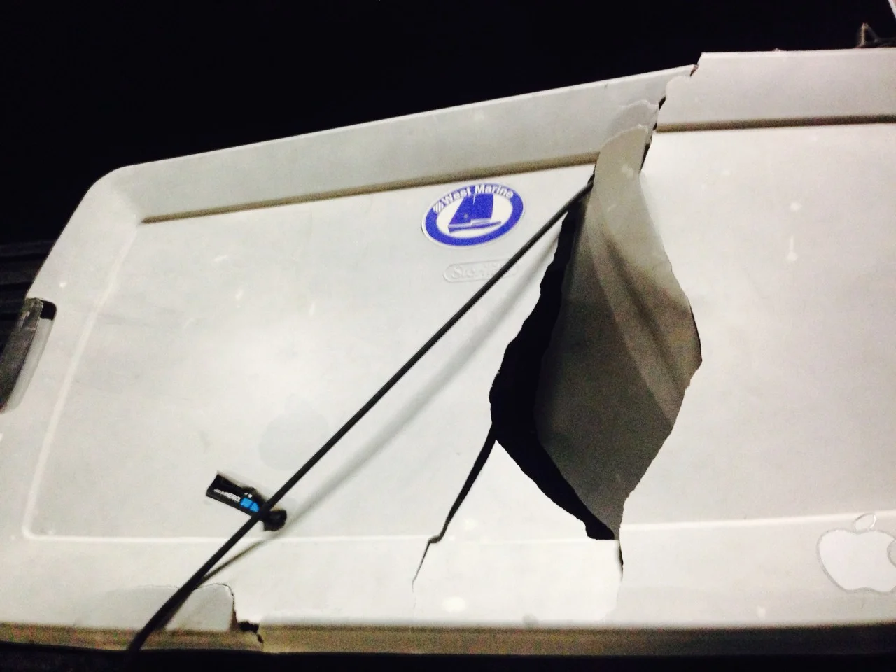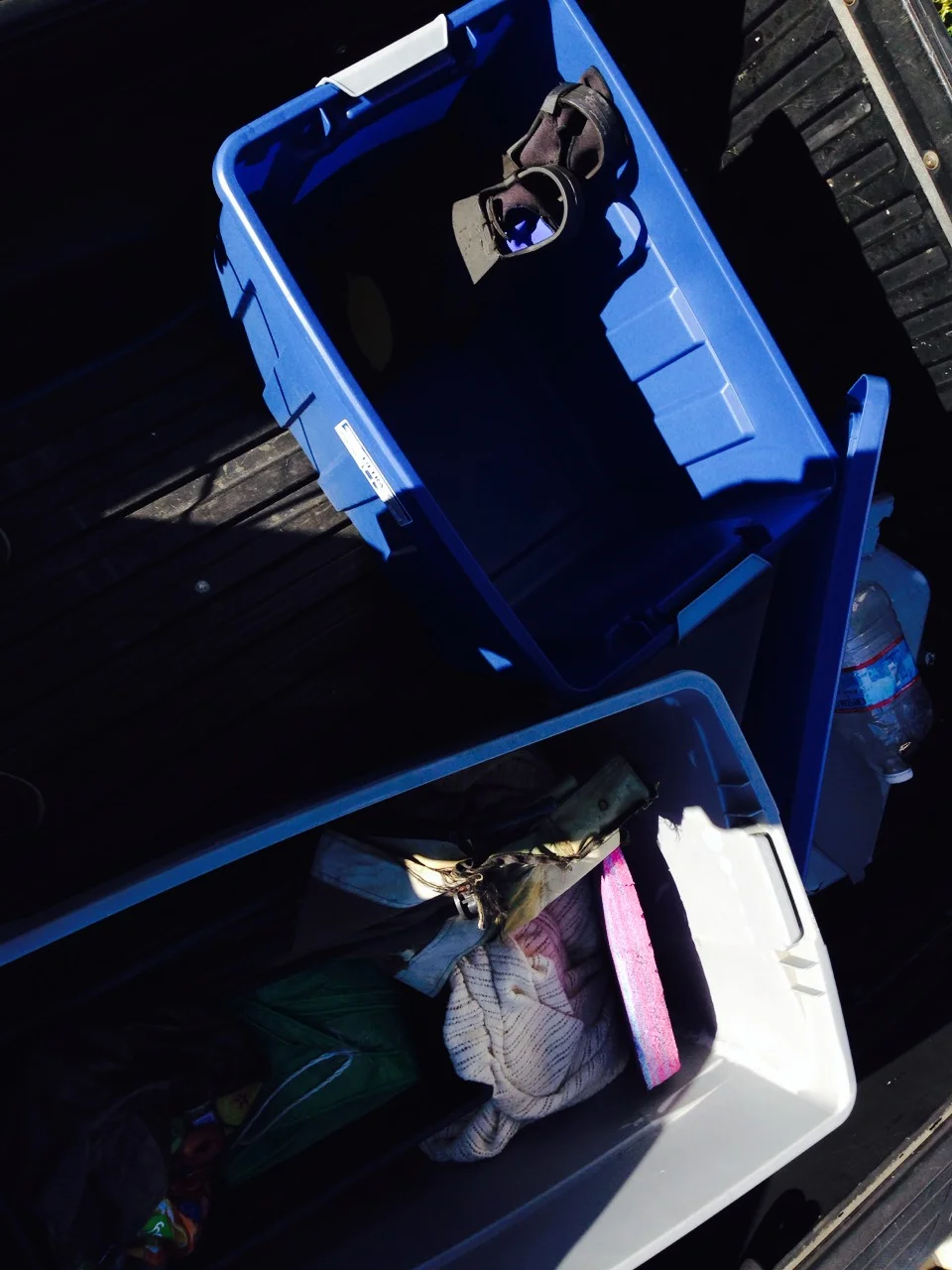 This grey plastic bin was purchased when I first got my old catamaran sailboat. It held parts and miscellaneous things like life jackets and tools and I could pull it everywhere that I went sailing. When I moved on to A Cenoura and sold the catamaran I used this grey bin as a permanent trunk for my truck bed. The contents mostly swim fins and a surf leash, a couple jugs of water and a tarp. Well, it’s been about a year of it sitting in the sun and becoming brittle, then I accidentally stepped on it whole walking across the bed of my truck. The up side is that I got a new one which is lower-profile yet can hold the same amount of stuff.